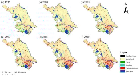 Land use and cover change of Jiangsu from 1995 to 2020: (a) 1995; (b) 2000; (c) 2005; (d) 2010; (e) 2015; (f) 2020.