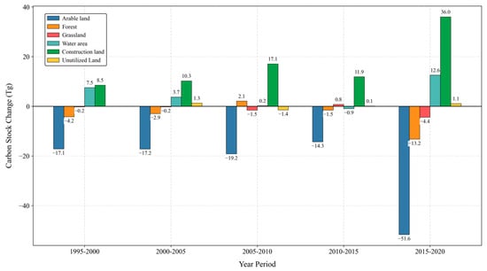 Among the different land use types, farmland lost the most carbon storage, with a total decrease of 119.417 Tg, accounting for the vast majority of the total decrease (Figure 4). This decline was primarily concentrated in two periods, 1995–2005 and 2015–2020, during which the carbon storage in cropland decreased by 34.337 Tg and 51.619 Tg, respectively. This means that the ongoing loss of farmland is the main reason why the ability to store carbon is decreasing. The forest land has been storing less carbon, showing a total decrease of 19.768 Tg. Although there was a temporary increase of 2.105 Tg in carbon storage between 2005 and 2010, this was not sufficient to reverse the overall declining trend, suggesting that the quality and connectivity of forest resources may not have been effectively improved. Grassland experienced a relatively smaller decrease in carbon storage, with a cumulative reduction of 5.586 Tg. However, the decline was more pronounced during the 2005–2010 period (−1.537 Tg), indicating a weakening of its carbon sequestration function.