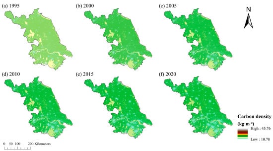 Overall, the evolution of carbon density in Jiangsu Province from 1995 to 2020 showed a characteristic pattern of “initial improvement followed by decline”, with its spatial pattern being significantly influenced by urbanization and land use changes. This result shows the balance between economic growth and saving carbon in the environment. It indicates that Jiangsu Province should improve its ability to store carbon by planning land use better and protecting the environment to manage land resources sustainably while meeting the “dual carbon” goals.
