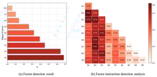 The findings reveal that socio-economic variables exhibit stronger interpretative capacity. In particular, the q-statistic associated with GDP (X2) reaches 0.68, the highest among all considered indicators, suggesting that economic development serves as the principal influencing factor in shaping the spatial pattern of the research object. The q-value for the nighttime light index (X3) is 0.64, showing a strong consistency with GDP, reflecting the spatial coupling relationship between human activity intensity and economic activity levels. The q-value for population density (X1) is 0.45, also exhibiting strong explanatory power, further emphasizing the role of population agglomeration in shaping regional spatial patterns. In contrast, the q-values for natural geographical factors are generally lower. The q-values for slope (X5) and aspect (X6) are 0.39 and 0.32, respectively, and although they are not as high as the economic variables, they still show a certain degree of influence, indicating that topographical conditions have a structural constraining effect on spatial differentiation. The q-value for elevation (X4) is 0.26, with a relatively limited individual contribution. The accessibility variables (X7: distance to water bodies, X8: distance to roads, and X9: distance to railways) all have q-values below 0.15, indicating that their explanatory power for spatial heterogeneity is weak when considered individually, and their role in interaction terms needs further investigation.