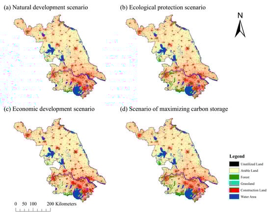 This situation accepts that the trend of land use changes will proceed via the natural development of Jiangsu Province from 1995 to 2020. It quantifies the evolution of various land areas in the natural development process without policy intervention. This scenario provides a reference for future land use based on historical trends.