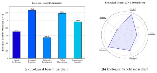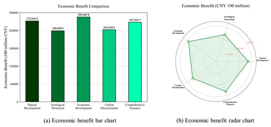 The Integrated Scenario performed well across all three types of indicators, with ecological benefits of CNY 119.952 billion, economic benefits reaching CNY 2675.317 billion, and carbon storage at 1540.144 Tg, values that are close to the optimal range. This scenario reflects a balanced synergy between ecological protection and economic development, representing a relatively optimal solution under multi-objective coordination.