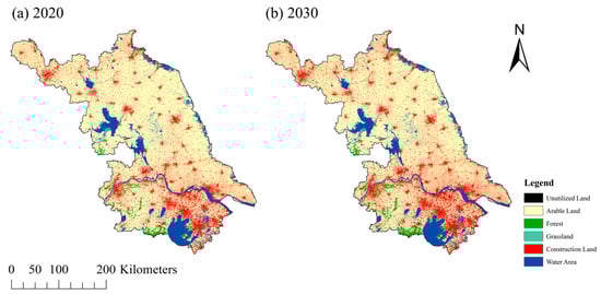 Aiming to maximize economic benefits, this scenario focuses on promoting urban–rural integration, strengthening urban infrastructure construction, increasing urbanization rates, and building new types of cities. Economic development is prioritized to investigate the ideal financial benefits of land use in Jiangsu Area by 2030 beneath existing limitations. This approach assesses the economic potential of land use in Jiangsu Province, providing an important reference for enhancing land use economic benefits and promoting land economic development.