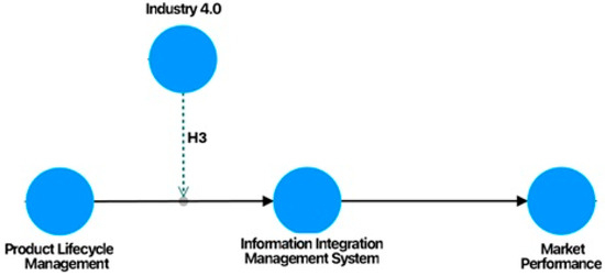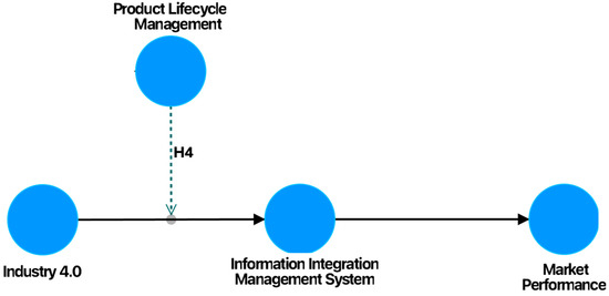 PLM facilitates the effective application of I4.0 technologies within IIMS, promoting more integrated and complete information management and a more robust MP [23]. In addition, it was also possible to identify that PLM can act as a mediator between I4.0 and IIMS, enhancing the benefits of this technological integration [22]. Thus, for Hypothesis H4, we elaborated the conceptual framework of Figure 3.