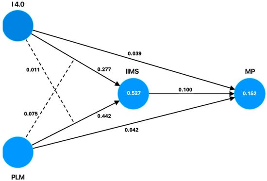 Regarding the path coefficients of the structural model (Figure 4), it is possible to observe that the path between I4.0 and MP presents a relationship of 0.039. In contrast, the path in which the IIMS is the medium between I4.0 and MP presents a relationship of 0.277 added to 0.100, resulting in 0.377. The direct relationship between PLM and MP is 0.042, while the path in which the IIMS is the medium between PLM and MP presents a relationship of 0.442 added to 0.100, resulting in 0.542. These results demonstrate the important role of the IIMS as a connecting link between I4.0 and PLM with MP.