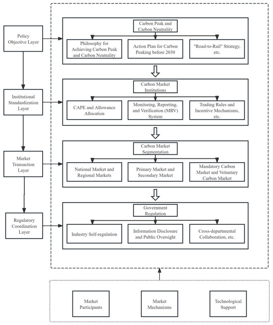 Unlike traditional carbon trading research focusing solely on institutional or market dimensions, this study closely integrates top-level policy objectives with bottom-level market behaviors, positioning institutional standards and regulatory coordination as critical intermediate linkages, thus creating a closed-loop governance pathway that links top-down policy guidance with bottom-up market feedback. Additionally, this study identifies “three horizontal dimensions”—market participants, market mechanisms, and technological support—as essential supporting elements seamlessly integrated across the four-layer architecture, forming a multidimensional, interactive governance framework. Clearly defining vertical layers and thoroughly integrating horizontal dimensions significantly strengthens coordination and logical coherence across different layers within the carbon trading mechanism, ensuring systemic rigor, scientific validity, operational practicality, and policy effectiveness.