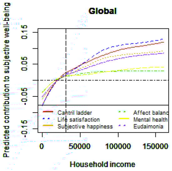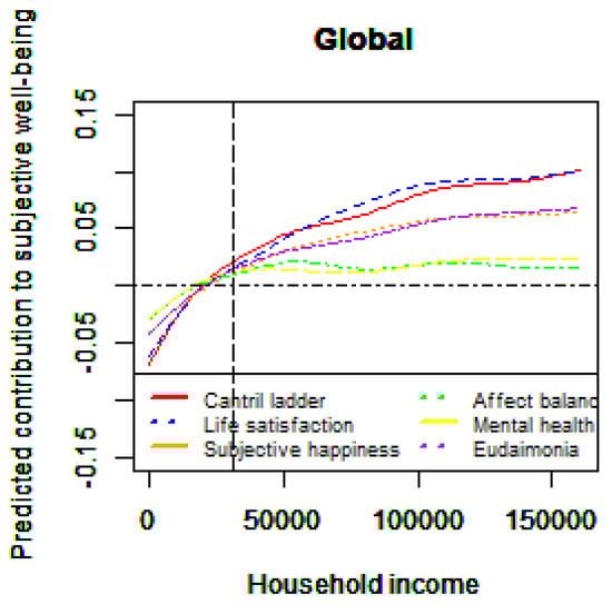 Furthermore, our estimation results allow us to classify the six SWB measures into three groups: (1) mental health and affect balance, (2) subjective happiness and eudaimonia, and (3) life satisfaction and the Cantril Ladder. While the income–SWB relationships for the Cantril Ladder and life satisfaction are nearly identical, subjective happiness generally shows a shallower upward trend—consistent with Diener et al. [24]—suggesting that subjective happiness is more susceptible to emotional factors. Eudaimonia also tends to rise more slowly than the Cantril Ladder, and the income–SWB relationships for subjective happiness and eudaimonia follow a similar pattern. This finding is in line with Sanjuan [25], who distinguished eudaimonia, subjective happiness, and life satisfaction, arguing that eudaimonic well-being may influence prudential happiness or life satisfaction via hedonic well-being. It also aligns with the findings of Peterson et al. [22], who developed a measure grounded in Seligman’s theory of authentic happiness, encompassing hedonic well-being (group (1)), eudaimonia (group (2)), and life satisfaction (group (3)). Similarly, it resonates with Haybron [68], who categorized happiness into three philosophical components: psychological (pleasant life, group (1)), perfectionist (meaningful life, group (2)), and prudential (engaged life, group (3)).