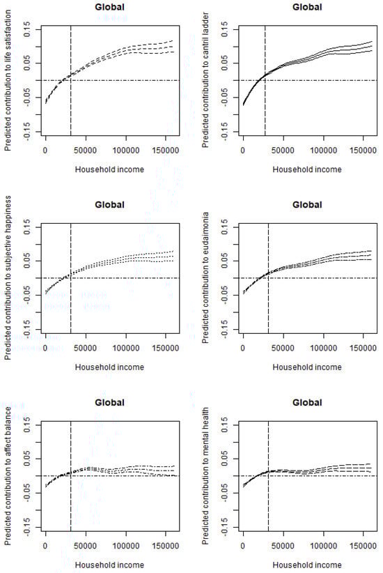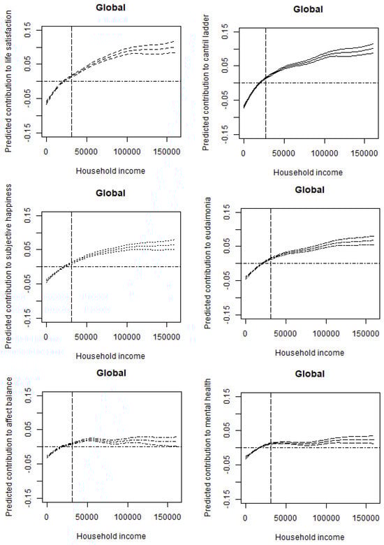 Furthermore, when we group the six SWB indices into three categories—(1) affect balance and mental health, (2) subjective happiness and eudaimonia, and (3) life satisfaction and the Cantril Ladder—we observe that the 95% confidence intervals do not overlap between these groups, although overlaps do occur within each group. Nevertheless, some within-group variations emerge. In group (1), for instance, the predicted slope for affect balance flattens at approximately USD 75,000, whereas mental health does not exhibit the same pattern. In group (2), although the confidence intervals overlap, the predicted contribution to life satisfaction tends to exceed that of the Cantril Ladder. Finally, within group (3), subjective happiness shows a greater predicted contribution than eudaimonia.