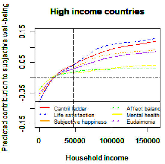 Despite these differences, both groups exhibit a common pattern. For all SWB indexes, the slope is positive but diminishes as it approaches approximately USD 20,000, with a pronounced decline around this level. This suggests that USD 20,000 may be a pivotal income threshold at which individuals can adequately address their basic needs. Notably, this benchmark appears relevant for both developing and developed countries, indicating a potentially universal trend.