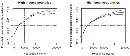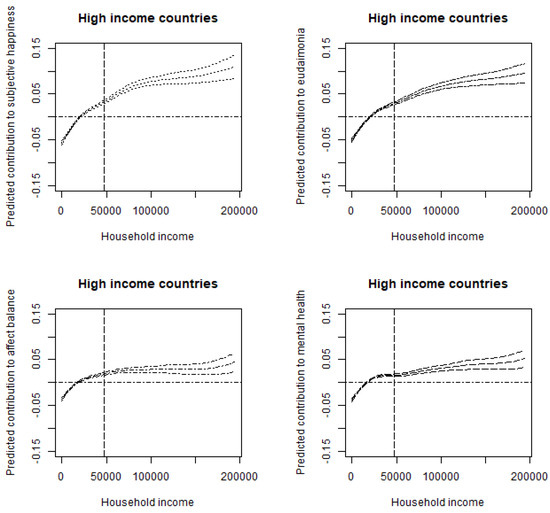 Relationship between household income and subjective well-being for subsamples by SWB indexes (high-income countries) Notes: The upper and lower lines correspond to a 95% confidence interval using a Bayesian approach. The vertical dotted line corresponds to the sample average of household income. High-income economies are Australia, United States, Sweden, the Netherlands, United Kingdom, Canada, Germany, France, Japan, Italy, Spain, Greece, Czech Republic, and Poland. To consider outliers, for each figure, we eliminate households with income above the 99th percentile income level, limiting the horizontal axis (USD 0 to 99th percentile of household income in each county). Control variables are gender, age, age squared, marital status, year dummy (time-fixed effects), and country dummy (country-fixed effects).