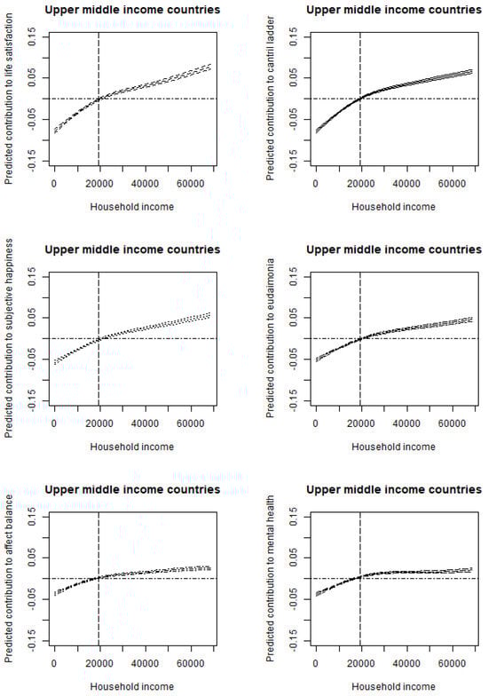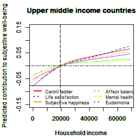 Relationship between household income and subjective well-being for subsamples by SWB indexes (Upper middle-income countries) Notes: The upper and lower lines correspond to a 95% confidence interval using a Bayesian approach. The vertical dotted line corresponds to the sample average of household income. Upper middle-income economies are Brazil, China, Colombia, Chile, Malaysia, Mexico, Russia, Romania, Thailand, and Venezuela. To consider outliers, for each figure, we eliminate households with income above the 99th percentile income level, limiting the horizontal axis (USD 0 to 99th percentile of household income in each county). The control variables include gender, age, age squared, marital status, year dummy (time-fixed effects), and country dummies (country-fixed effects).