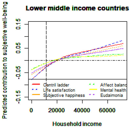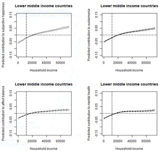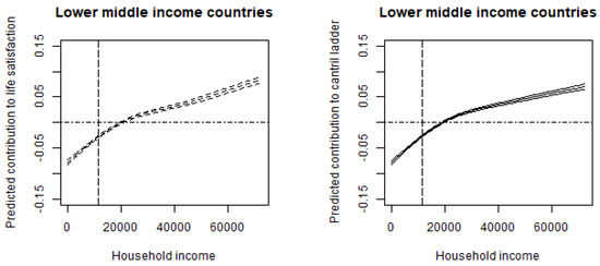 Relationship between household income and subjective well-being for subsamples (lower middle-income countries) Notes: The vertical dotted line corresponds to the sample average of household income. Lower middle-income economies are Egypt, India, Mongolia, Myanmar, the Philippines, South Africa, Sri Lanka, and Vietnam. To consider outliers, for each figure, we eliminate households with income above the 99th percentile income level, limiting the horizontal axis (USD 0 to 99th percentile of household income in each county). The control variables include gender, age, age squared, marital status, year dummy (time-fixed effects), and country dummies (country-fixed effects).
