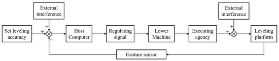 Automatic leveling technology is a key technology that ensures mechanical equipment, vehicles, or tools maintain a level or specific angle on uneven terrain or in dynamically complex environments [8]. Automatic leveling technology is based on a feedback control system, which uses attitude sensors to obtain the tilt angle and position information of the equipment. The controller processes and calculates the adjustment amount, driving the actuator for attitude adjustment, enabling the equipment to achieve a level state, ensuring the stability and safety of equipment operation. A typical control loop of an automatic leveling system is shown in Figure 1.