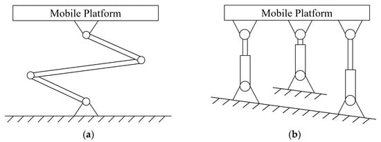 The automatic leveling system generally includes three main modules: sensors, control systems, and actuators. The control system is the core of the entire automatic leveling system, responsible for receiving signals from sensors and issuing commands to drive the actuators to perform corresponding actions. Based on the configuration of the actuator’s movement branches, it can be divided into two types: series type and parallel type [9]. In the series type automatic leveling mechanism (as shown in Figure 2a), there is only one movement chain, with each leg independently controlled, providing high flexibility, and the components in the movement chain are connected end to end in a series arrangement. In contrast, the parallel automatic leveling system (as shown in Figure 2b) has a shorter movement chain, with multiple movement chains acting together in the working space, offering excellent stability and overturning resistance. The advantages and disadvantages of the two types of actuators are summarized in Table 1. In orchard mechanization operations, parallel automatic leveling systems have been applied in high-load scenarios such as fruit transportation, automatic leveling of manned platforms, and leveling the chassis of working machines due to their outstanding stability and load-bearing capacity. With the continuous in-depth research on parallel mechanisms and the ongoing development of kinematic solution algorithms for parallel mechanisms [10,11], parallel automatic leveling mechanisms are gradually being widely adopted.