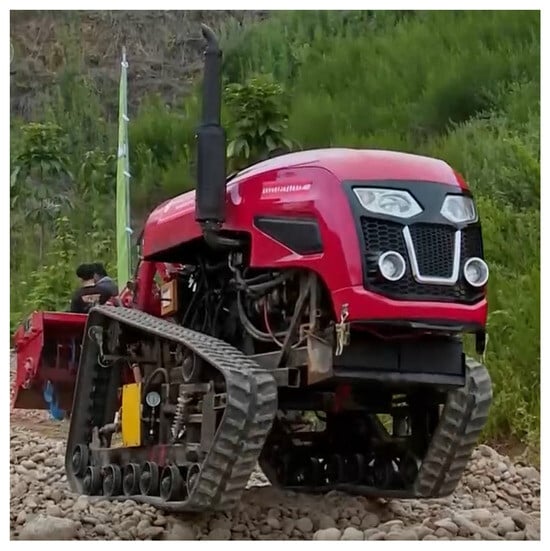 - Liu, H.P.; Yang, F.Z.; Liu, S.; Lu, Y. Effect of Mechanism of Height Difference on Stability of Miniature Crawler Hillside Tractor. Tract. Farm Transp. 2013, 40, 18–21. [Google Scholar]