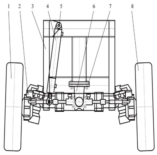 Schematic diagram of the three-point automatic leveling mechanism: 1. left drive wheel; 2. front steering drive axle; 3. vehicle body; 4. leveling cylinder; 5. fixed hinge support; 6. swing support seat; 7. frame fixed support; 8. right drive wheel.