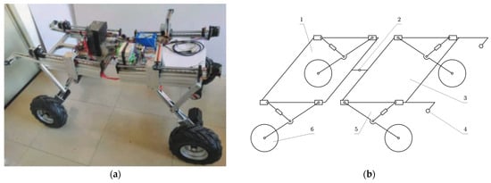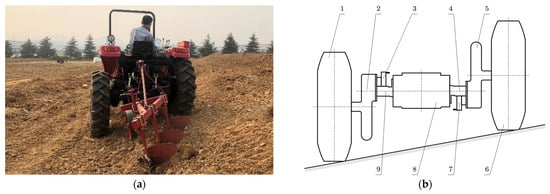 (a) Remote-controlled omnidirectional leveling tracked tractor prototype. (b) Schematic diagram of the attitude active adjustment mechanism: 1. left wheel; 2. left final drive assembly; 3. left swinging mechanism; 4. right axle sleeve; 5. right final drive assembly; 6. right wheel; 7. right swinging mechanism; 8. rear drive axle; 9. left axle sleeve.