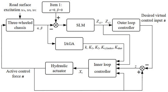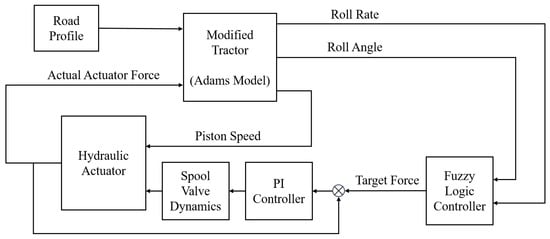 To address the issues of control and stability of tractors moving on steep slopes, Behrooz Mashadi et al. [35] designed a two-layer controller consisting of a fuzzy upper controller and a PI lower controller to control the stability of the tractor. The structure of the controller is shown in Figure 6, consisting of an inner loop and an outer loop control circuit. The outer loop controller is mainly used for roll control, outputting the target hydraulic force based on the tractor’s roll angle and roll rate, while the inner loop controller is mainly used for force tracking control of the hydraulic system, avoiding overshoot and instability phenomena caused by the nonlinear regulation exhibited by the hydraulic system due to residual structural damping and back pressure generated during operation. Iman Ahmadi [36] studied the effects of forward speed, ground slope, and wheel–ground friction coefficient on the lateral stability of tractors under the presence of position disturbances, proposing that to improve the overall stability of tractors, priority should be given to increasing the stability index derived from slip dynamics.