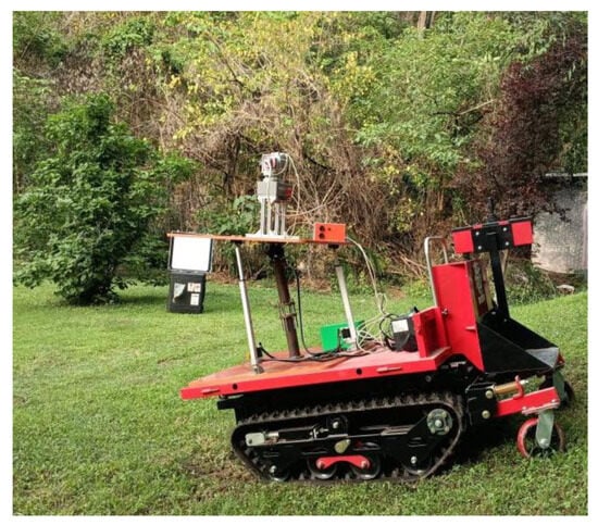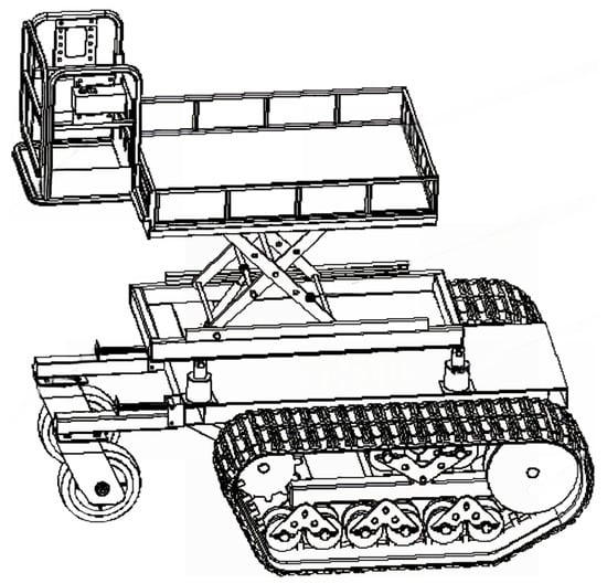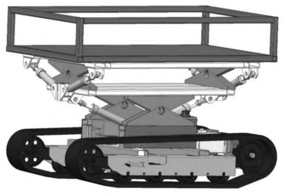 Sang-Sik Lee et al. from Korea’s Gyeongdong University [52,53] designed an automatic leveling system to address potential safety issues related to orchard aerial work machinery operating on unpaved roads and slopes. The working principle involves installing lateral hydraulic rods on both sides of the chassis, using lateral tilt angle sensors to measure posture information, which is processed by a controller to drive the lateral hydraulic rods’ extension and retraction, thereby controlling the automatic leveling of the work platform. The Jang team from Kyungpook National University [54] developed a tracked automatic leveling lift platform (as shown in Figure 11), which utilizes a hybrid power system, with a maximum lifting height of 2500 mm, and a maximum adjustable working width of 2900 mm. Even when the machine’s body tilts at angles of ±20°, the work platform can still accurately maintain within a frame angle range of ±0.5°. The response time is only 1 s, greatly enhancing stability and work efficiency in complex environments.