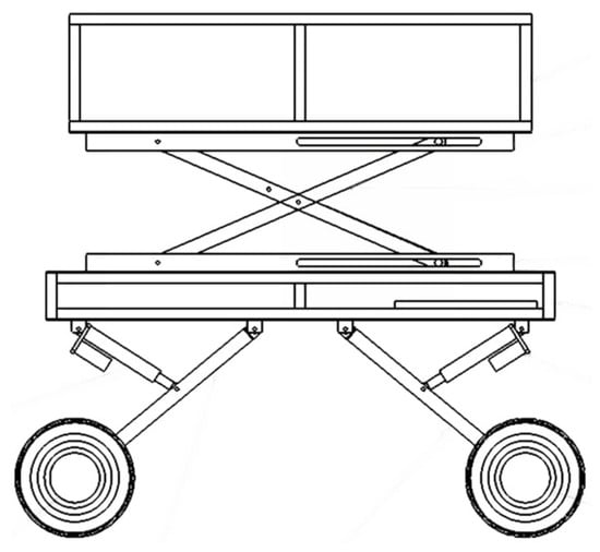 The aforementioned orchard operation platforms all have a fixed chassis, with the upper platform executing leveling function control logic. In contrast, the upper platform only performs lifting movements, while the chassis-leveling operation platform control logic, such as the all-terrain orchard operation platform invented by Lu Zemin et al. from Jiangsu University, is based on chassis leveling [44] (as shown in Figure 9). This operation platform’s chassis achieves real-time leveling through the actuation of electric cylinders, adapting to the orchard road conditions and reducing the likelihood of overturning. The design has a simple structure and good passability, but its adaptability to specific complex terrains still needs further validation.