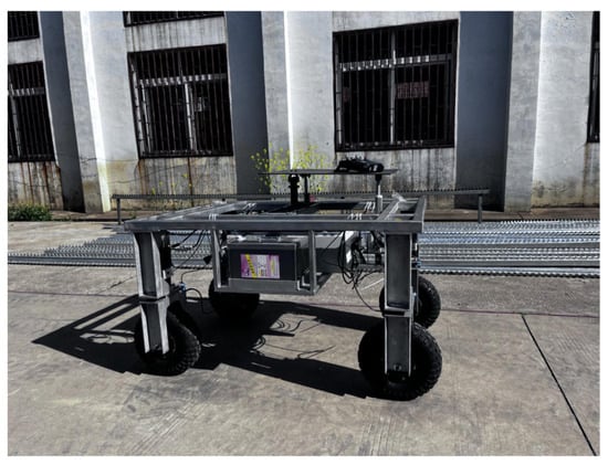 Li Zeao et al. from Huazhong Agricultural University designed a multifunctional working platform for orchards with four independent drive wheels to address the complex structure and poor maneuverability of traditional working platforms. This working platform [45], as shown in Figure 10, uses hub motors to achieve four-wheel independent drive and steering. It detects the tilting angle of the platform using angle sensors, which in turn drive two electric push rods to automatically adjust and achieve leveling of the working platform. The leveling angle range is from 0° to 10°, with an angle error of ±1°.
