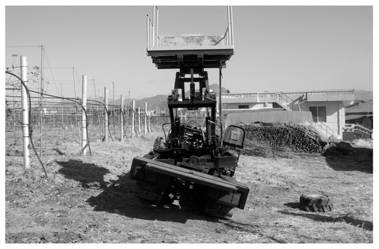 - Masao, N. Development and Improvement of Mobile Work Platform for Use in Apple Orchards. Jpn. J. Farm Work Res. 2006, 41, 68–73. [Google Scholar] [CrossRef][Green Version]