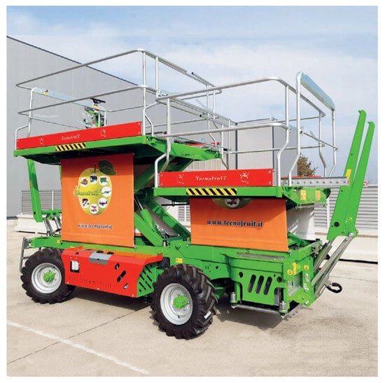 Crendon Machinery [55] of Australia produces a series of self-propelled all-terrain lift platforms, which use the principle of a parallel four-bar mechanism to ensure that the upper working platform remains parallel to the ground at all times. Tecnofruit [56] of Italy produces a fruit harvesting auxiliary platform (as shown in Figure 12). This platform features two working surfaces; the front platform can be raised to 3 m, while the rear platform is fixed at a height of 1 m. The platform is equipped with a fork-like lifting device with an inclined angle to facilitate the loading and unloading of boxed fruits. In addition, the platform has a lateral leveling function, allowing for it to operate stably in hilly and sloped areas.
