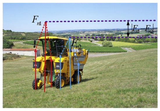 To address the issue of agricultural vehicles operating in complex terrain being unable to predict rollover risks using conventional methods, Denis et al. from Clermont University in France proposed an online adaptive observer based on lateral load transfer (LLT) estimation. The transfer process is shown in Figure 15. This method mainly relies on the coupling between intermittent measurements and stability assessment, combined with changes in the vehicle’s center of gravity height and mass to assess and avoid the rollover risk of grape harvesters when working in complex terrain, thus driving the hydraulic leveling system (as shown in Figure 16) to control the posture of the harvester body [63]. Due to the reliance of this algorithm on the online adjustment of the dynamic model, its robustness and accuracy mainly depend on the accuracy of the model and its real-time adjustment capability.