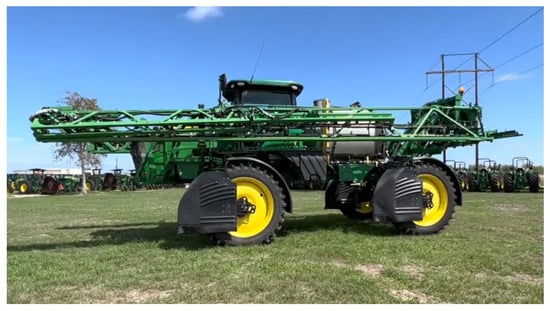 - Xiong, H. Brief Introduction of Deere New R4038 Self-Propelled Spraying Machine. Mod. Agric. 2014, 49. [Google Scholar] [CrossRef]