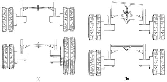 - Pijuan, J.; Cornelias, M.; Nogues, M.; Roca, J.; Potau, X. Active Bogies and Chassis Levelling for a Vehicle Operating in Rough Terrain. J. Terramech. 2012, 49, 161–171. [Google Scholar] [CrossRef]
