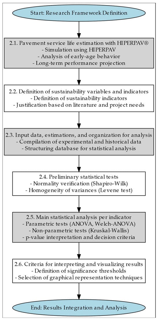 The methodology is structured in six interconnected phases (Figure 1). First, pavement service life is estimated using HIPERPAV® simulations [36,37], considering the early behavior of the concrete and its long-term structural performance. Then, sustainability variables and indicators are selected based on the existing literature and project criteria.