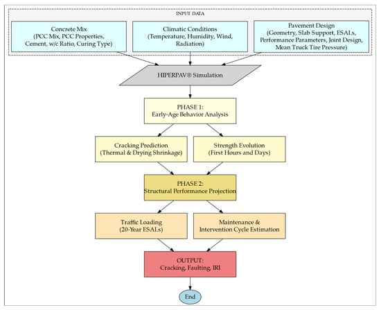 Figure 2 illustrates the methodological framework implemented to simulate the service life of the pavement. The process begins with the integration of input data, including climatic conditions (e.g., temperature, humidity, wind, and radiation), pavement design parameters (e.g., geometry, slab support, joint design, traffic pressure), and concrete mix properties (e.g., PCC composition, cement content, water–cement ratio, and type of curing). These inputs feed the HIPERPAV® simulation environment. The first phase focuses on early-age concrete behavior, analyzing the risk of cracking due to thermal and drying shrinkage, as well as strength development in the initial hours and days. The second phase projects the long-term structural performance of the pavement over a 20-year horizon, considering traffic load accumulation and estimating maintenance and intervention cycles. This two-phase simulation approach provides a technically robust and context-sensitive representation of pavement deterioration, aligned with the sustainability indicators evaluated in subsequent sections.