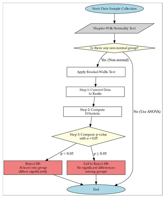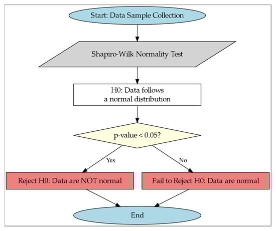 Figure 3 illustrates the decision-making process for the Shapiro–Wilk test. A data sample is initially collected, and a normality test is performed. If the resulting p-value is higher than or equal to 0.05, the null hypothesis (H0) is not rejected, implying that the data can be considered normally distributed. However, if p < 0.05, H0 is rejected, concluding that the data distribution differs significantly from a normal distribution.