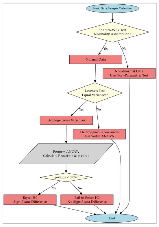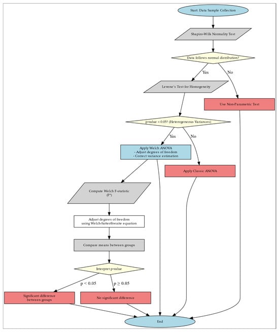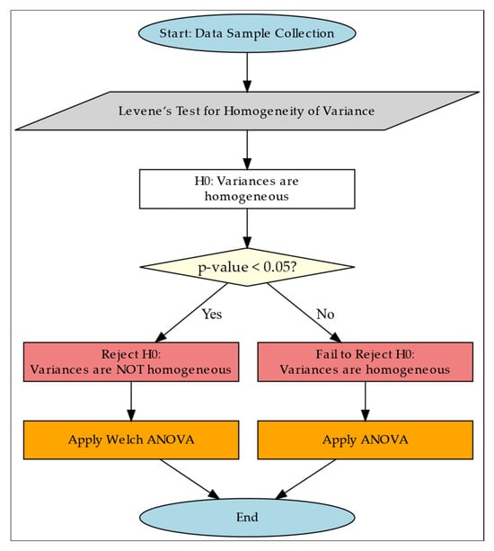 Figure 4 illustrates Levene’s test procedure using a flowchart. It begins with data collection and the test application under the null hypothesis (H0) that the variances between the groups are homogeneous. The p-value is then evaluated; if it is higher than or equal to 0.05, H0 is not rejected, concluding that the variances are equivalent, and an ANOVA can be used. In contrast, if p < 0.05, H0 is rejected, so the variances are significantly different; therefore, the Welch ANOVA test should be used.