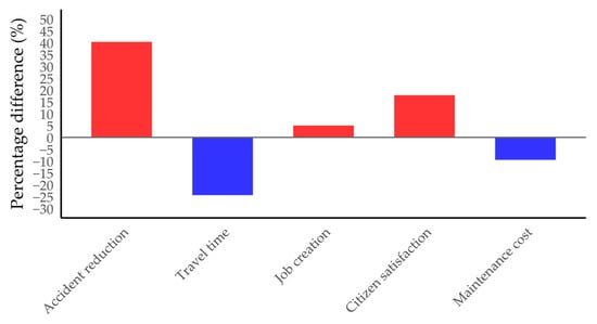 Social: Accidents avoided (%), cumulated travel time (minutes), citizen satisfaction (%), and job creation (persons/year).