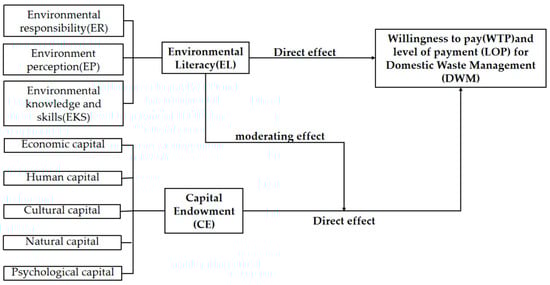 When actors make various judgments and choices, their willingness to select is not limitless, free, and arbitrary; rather, they frequently confront capital endowment (CE) limits. The concept of capital endowment encompasses a wide range of factors, including not only the amount of monetary funds owned by the actor, but also the cultural level and other intangible assets that represent the actor’s ability and advantages in a specific field and can bring potential benefits to the actor. Due to capital endowment limits, actors must decide whether to give up when faced with multiple behavioral options with potential value. This abandonment conduct closely correlates with a lesser willingness to engage in the relevant behaviors. Actors are not unwilling to pursue better growth possibilities or achieve greater goals; rather, they are constrained by their own poor capital endowment, unable to translate their ambition into tangible actions. At the structural level, the lack of economic capital tends to create rigid constraints, while the ecological fragility of natural capital exacerbates the dilemma; at the cognitive level, the inadequacy of human capital creates implicit barriers to knowledge, the path dependence of cultural capital manifests itself in the suppression of innovative behaviors by traditions, and psychological capital emphasizes the divergence of preferences. This effect of capital endowment constrains actors’ willingness to choose and is especially evident in a social environment of uneven economic development and unequal distribution of resources, where there is a significant gap in behavioral choices and expressions of willingness between different actors due to differences in capital endowment []. Many scholars have investigated the impact of CE on rural households’ adoption of environmentally friendly technologies [,,] and green production behavior [,,]. Previous studies have proved that CE can effectively encourage farmers to participate in village environmental governance [,,,]. It was discovered that CE has a considerable favorable influence on rural households’ WTP for rural human settlement improvement []. However, CE is not a monolithic concept; rather, it interacts and functions in concert with a wide range of other elements. Micro-level analysis reveals a strong correlation between an individual’s environmental literacy (EL) and CE. Farmers who are more environmentally literate are more aware of the value of enhancing rural habitat and are more prepared to pay a higher price for better environmental conditions. In addition to being a body of information, EL is a set of values and a code of conduct that affects farmers’ daily decisions and actions. It can only play a better role by combining the talents and abilities that people have learned in practice. However, few studies have examined WTP by combining personal EL with farmers’ CE. An essential antecedent variable for forecasting environmental behavior is EL. It was discovered that farmers’ behavior, willingness, or decision-making is significantly influenced by EL, as well as the environmental awareness and environmental responsibility (ER) dimensions [,,]. Farmers with a higher sense of responsibility were thought to be more willing and invested in DWM in terms of WTP []. Xie et al. confirmed that rural residents’ WTP for centralized DWM grows more robust the greater their environmental emotion and the higher their level of environmental cognition [].