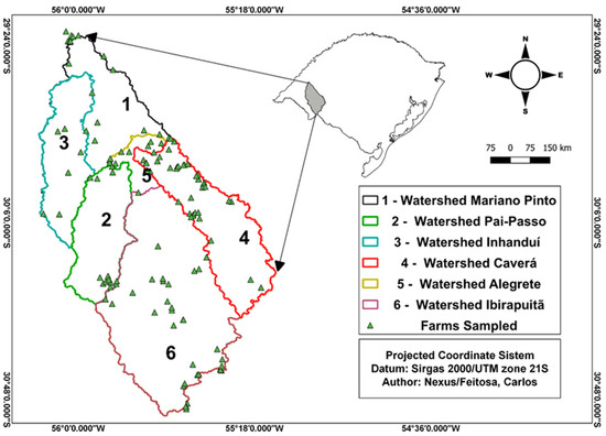 Figure 2. The spatial location of the farming systems sampled in each sub-basin of the Ibirapuitã River in the Brazilian Pampa region. Source: Viana et al. [34].