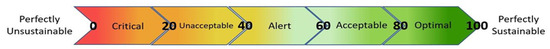 The fifth stage was the integration and analysis of the results. The sustainability indices range from 0 to 100. In a specific analysis of sustainability within the dimensions (water, energy, and food), the indices were measured from the weighted composition of each indicator. Ultimately, the closer the value is to 100, the greater the sustainability attributed to the index. In this way, it was possible to create a scale of sustainability levels for the WEF nexus, as shown in Figure 3.