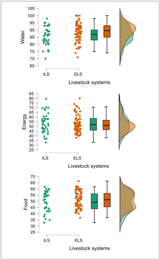 The presentation of the results compares the levels of sustainability between and within the water, energy, and food nexus (WEF nexus) in extensive livestock systems (ELSs) and integrated livestock systems with agriculture (ILSs) located in the Pampa region of Brazil. Figure 4 shows the dispersion, descriptive measures, and distribution of the WEF nexus sustainability indices and their scopes using a raincloud diagram. The sustainability indices of the water–energy–food nexus (WEF nexus) of the ELSs and ILSs sampled showed a distribution close to normal, favoring an inferential perspective of the results. The ELSs showed slightly higher medians than the ILSs in the water and food dimensions, except for the energy dimension. The ELSs showed sustainability indices in the WEF nexus with more homogeneous and consistent distributions than the ILSs.