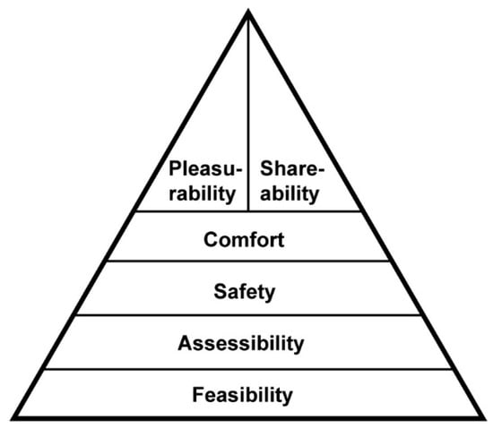- Alfonzo, M.A. To Walk or Not to Walk? The Hierarchy of Walking Needs. Environ. Behav. 2005, 37, 808–836. [Google Scholar] [CrossRef]