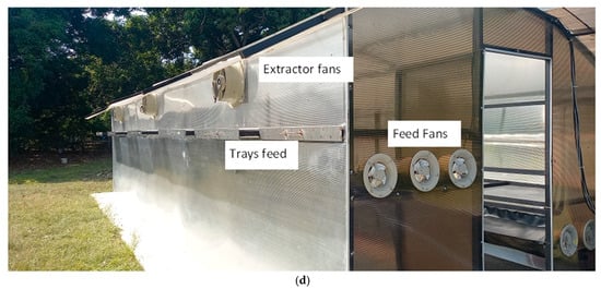 Table 2. An operation time of 10 min/hour was considered for both exhaust fans and intake fans, as preliminary tests showed that this time was enough to reach appropriate and homogeneous air conditions inside the chamber regarding T and RH, maintaining a reasonable driving force and low energy consumption, as the air temperature remained high while RH showed low values. The experiment lasted 10 h per day, as preliminary tests showed that 8 h of drying without the photovoltaic system were enough to reduce the moisture content of the mango slices to less than 12%. An additional 2 h were included as a security factor.