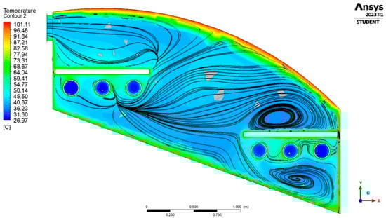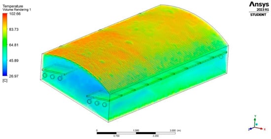 A similar analysis for temperature confirmed the influence of HH (p < 0.0001) and identified the effect of the P(l) (p = 0.0329) on the temperature profile. The effect of the P(l) indicates that there is a temperature gradient across the width of the dehydrator, where the highest temperatures are achieved near the walls and the lowest in the central corridor. This can be explained by the fact that walls contribute to the energy transfer by conduction in addition to heat transfer by convection, which increases the temperature more quickly in areas near the dehydrator walls, while in the center or corridor, the heat transfer occurs only by convection, which is a slower energy transfer method that increases the temperature more gradually. Additionally, the corridor has a large space that is not insulated, leading to high temperatures. The high temperatures achieved between 11 and 15 h of the day are correlated with the high irradiation that occurs at this time of day and with the direct incidence of solar rays on the drying chamber during this period.