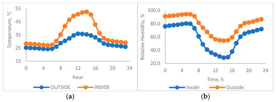 Figure 4b shows the relative humidity profiles of the internal and external dryer chambers throughout the day. From