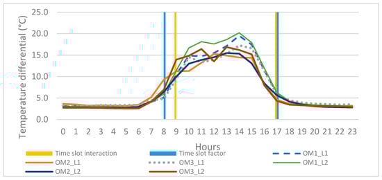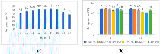 Table A7 shows the OM*HH interactions that show significant differences. Similar behavior was found for T°, for which the operation mode (OM), time (HH), and their interaction OM*HH were highly significant (