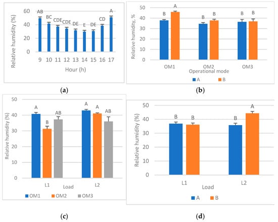 A similar case was found with the relative humidity behavior, in which all evaluation factors (the position, time, operational mode, and load) were significant (
