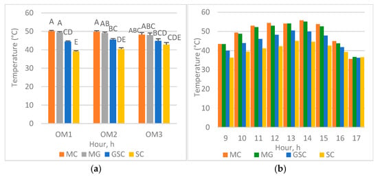 Figure 8a shows a temperature gradient from the top of the drying chamber (MC) to the floor (SC). The same figure shows how the OM affects the T° profile: OM3 reduces the gradient, while OM1 increases it. This confirms the homogenizing effect of OM3. Another point to highlight is the small difference found between the MG and GS in the dryer chamber, which highlights the insulating function that the geomembrane offers to avoid energy loss toward the ground. However, the highest temperature differences were found between the MG and GS, which also indicates that the geomembrane acts as a barrier to the homogenization of air properties within the drying chamber. Therefore, the geomembrane position should be evaluated.