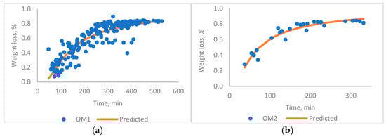 Figure 9 illustrates the dynamics of mango dehydration under the two operation modes, OM1 and OM2, which represent contrasting conditions. The first one, OM1, operates without any forced airflow and uses only passive energy to heat the air; the second one, OM2, uses passive energy but also incorporates forced airflow, making use of photovoltaic energy to operate the fans responsible for renewing and homogenizing the air.
