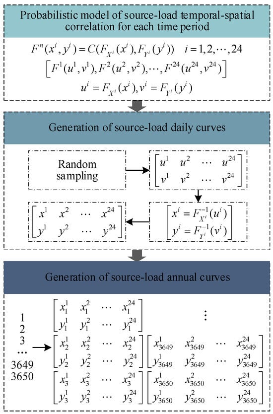 After obtaining the probabilistic model of source load temporal–spatial correlation based on Copula theory, we need to perform sampling to generate a large number of samples for subsequent analysis. The main steps of the sampling process are as follows: