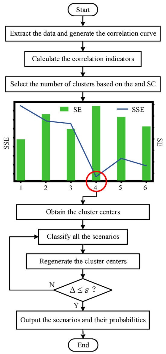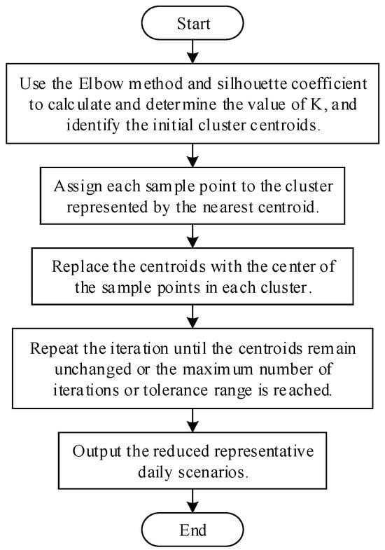The scenario reduction flowchart based on the K-means clustering algorithm is shown in Figure 3.