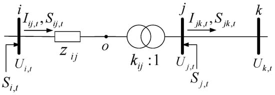 where represents the square of the voltage at node i at time t; represents the tap position of the OLTC installed on branch ij at time t in scenario s; represents the transformation ratio of the OLTC installed on branch ij at time t in scenario s; represents the unit adjustment step of the OLTC; represents the number of tap positions of the OLTC; and represent the amplitude of the transformation ratio of the OLTC on branch ij; and are auxiliary variables; and represents the combination of {0,1}.